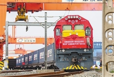 中歐班列是中法進(jìn)出口貿(mào)易的重要橋梁。圖為4月26日,為紀(jì)念成都國際班列十周年而開行的“法國郵政DPD專列”在四川省成都市青白江區(qū)國際鐵路港首發(fā)。白桂斌攝(人民視覺)