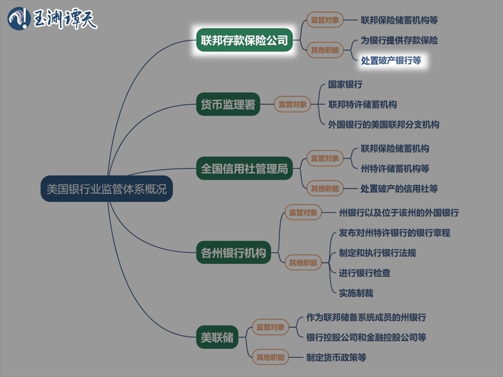 上圖是美國聯(lián)邦銀行業(yè)監(jiān)管體系的主要部門,可以看到,這個監(jiān)管體系覆蓋美國銀行業(yè)的上中下游,而FDIC職責(zé)之一是處置美國破產(chǎn)銀行。