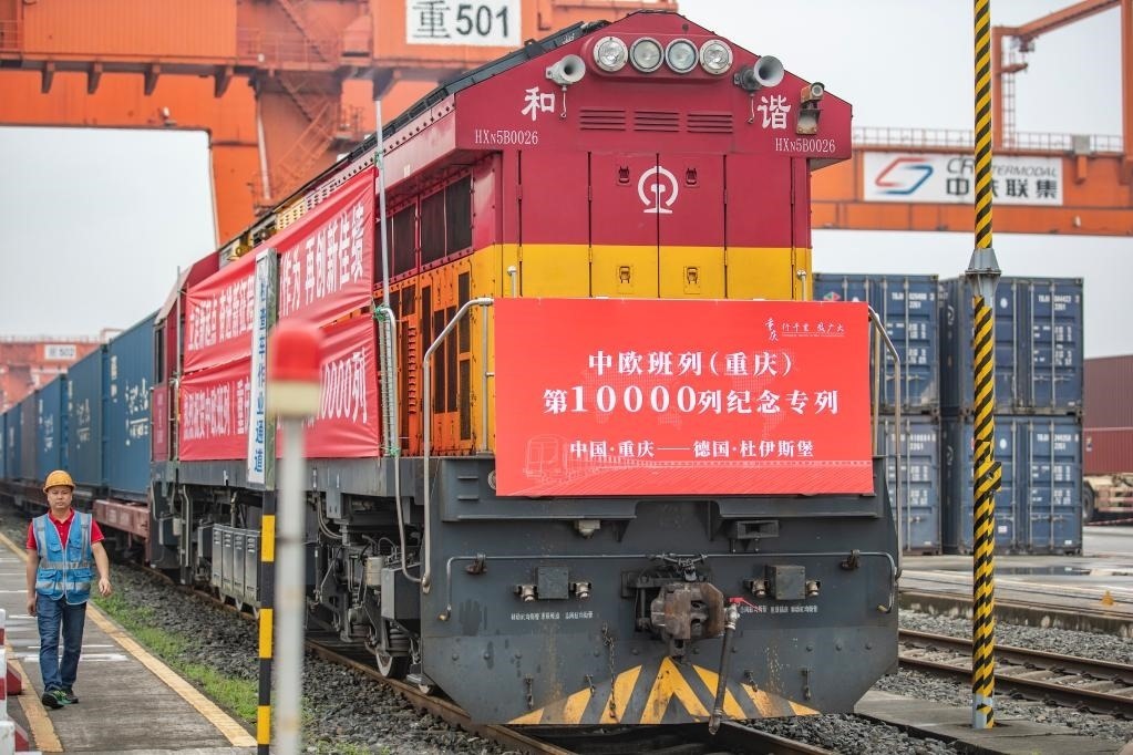 2022年6月23日,在重慶團(tuán)結(jié)村中心站,鐵路工作人員從中歐班列(重慶)第10000列列車旁走過。當(dāng)日,第10000列中歐班列(重慶)從重慶團(tuán)結(jié)村中心站順利駛出,奔赴德國杜伊斯堡。(新華社記者黃偉攝)
