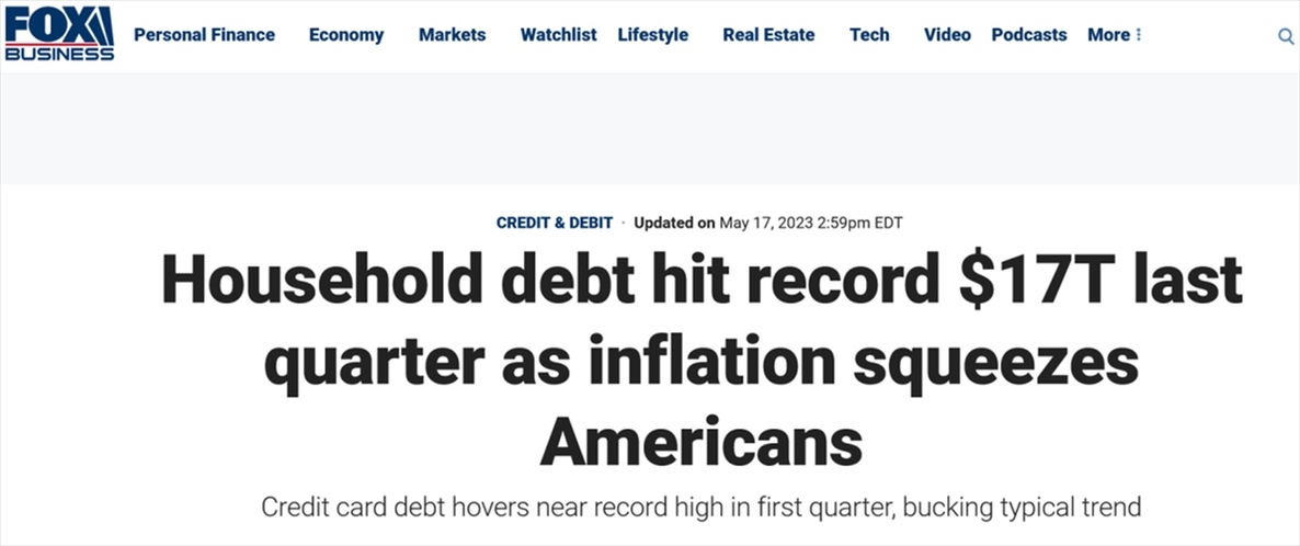 “通脹榨干了美國(guó)人,”對(duì)此,美國(guó)福克斯新聞網(wǎng)報(bào)道稱,“自2023年伊始,美國(guó)人的債臺(tái)更加高筑,有越來(lái)越多的美國(guó)家庭拖欠貸款?!?/p>