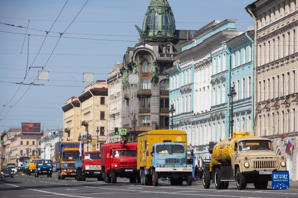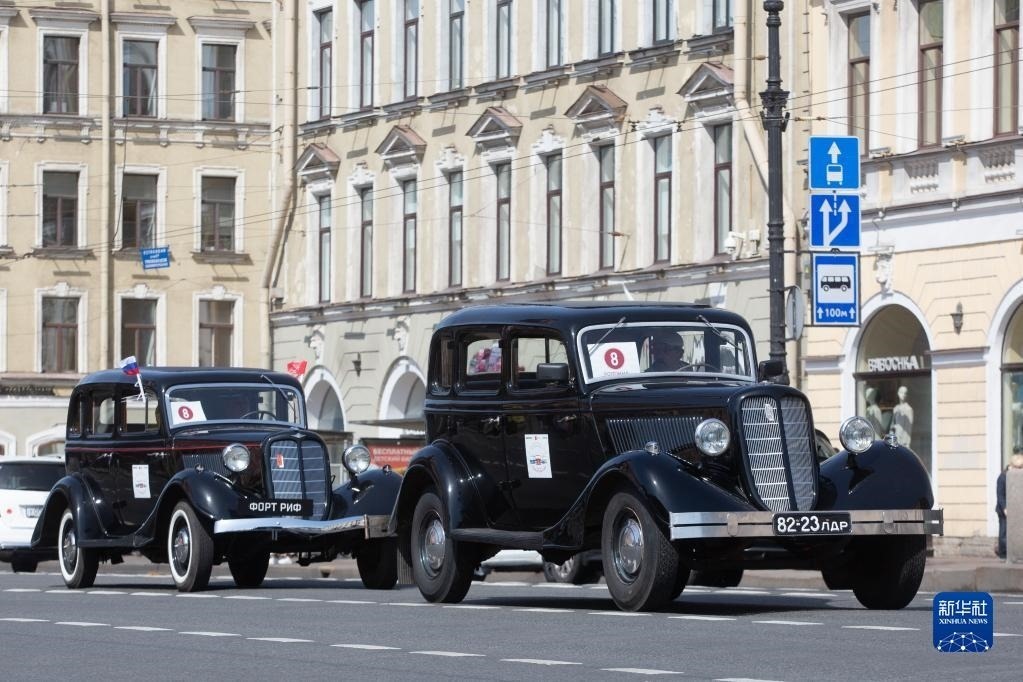 5月20日,老爺車在俄羅斯圣彼得堡街頭巡游。