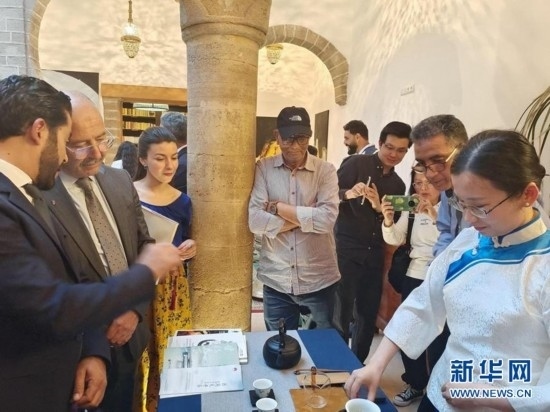 5月22日,在摩洛哥索維拉的“茶和天下·雅集”活動(dòng)暨中摩茶文化展上,嘉賓體驗(yàn)中國(guó)茶禮表演。(中國(guó)文化中心供圖)