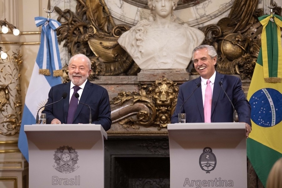 1月23日,在阿根廷布宜諾斯艾利斯,阿根廷總統(tǒng)費(fèi)爾南德斯(右)和巴西總統(tǒng)盧拉在玫瑰宮出席新聞發(fā)布會(huì)。新華社發(fā)(馬丁·薩巴拉攝)