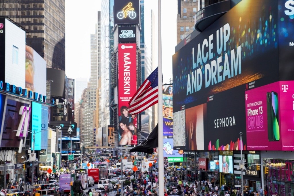 這是2022年5月17日在美國紐約時(shí)報(bào)廣場拍攝的美國國旗。新華社記者王迎攝