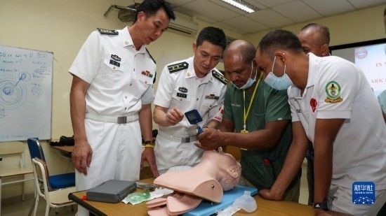 中國海軍“和平方舟”號醫(yī)院船派出醫(yī)療專家分隊赴東帝汶國立醫(yī)院進行ACLS培訓(xùn),醫(yī)院船醫(yī)療專家為當?shù)蒯t(yī)護人員進行實操講解(9月5日攝)。新華社記者 黎云 攝