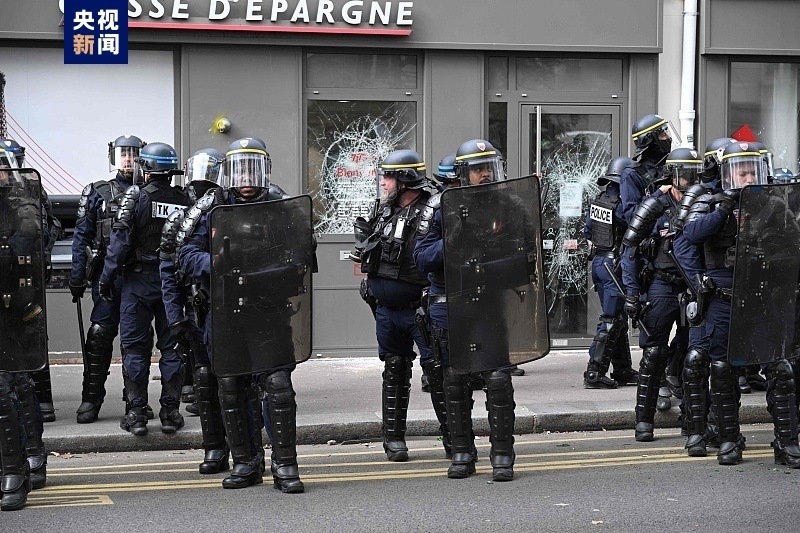 在法國首都巴黎,游行隊(duì)伍下午3點(diǎn)左右從北站平靜出發(fā)后,隨后一個(gè)由數(shù)百名蒙面男子組成的隊(duì)伍破壞了銀行機(jī)構(gòu)的櫥窗,并向一輛警車投擲石塊。巴黎警察局稱,這輛汽車遭到“鐵棍”的打擊。車上一名警察手持武器下車,以便與示威者保持距離。一支摩托車警察部隊(duì)隨后趕來,阻止了破壞行為并保護(hù)了車上的警察。