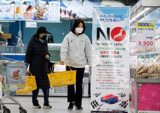 2021年4月14日,韓國(guó)首爾的一家農(nóng)協(xié)連鎖超市的水產(chǎn)商品貨架前打出“抵制日本”、“本店不銷售日本產(chǎn)產(chǎn)品”等標(biāo)語(yǔ),對(duì)日本政府決定將福島第一核電站核污染水排入大海表示抗議。 新華社發(fā)(徐儒錫攝)