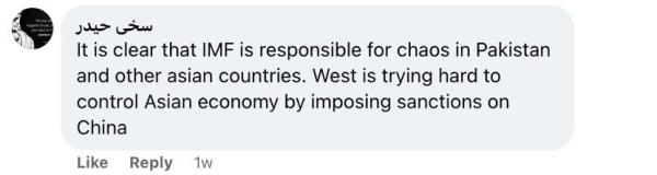 還有網(wǎng)友留言說:“國際貨幣基金組織對巴基斯坦和其他亞洲國家的混亂負(fù)有責(zé)任,這一點再清楚不過了。西方試圖通過制裁中國來控制亞洲經(jīng)濟(jì)?!?/p>