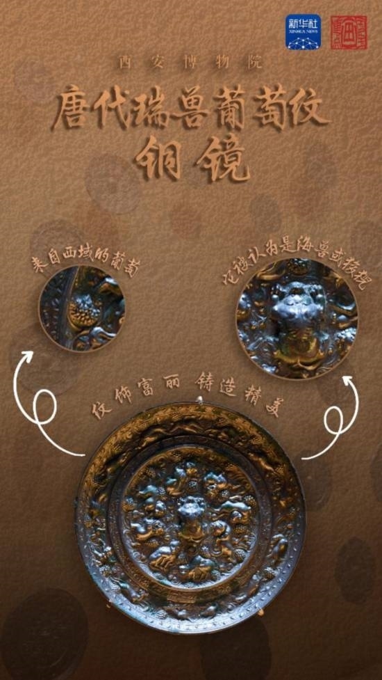 在唐代,我國銅鏡制作和使用進入繁盛時期,許多通過絲綢之路傳來的紋樣被工匠應(yīng)用在銅鏡上。瑞獸葡萄紋銅鏡紋飾富麗、鑄造精美,備受當(dāng)時民眾的青睞。瑞獸葡萄紋銅鏡將裝飾藝術(shù)和現(xiàn)實生活緊密結(jié)合,瑞獸象征著敏捷與美好,葡萄則象征著豐收充裕和多子多福,呈現(xiàn)出濃郁的盛唐氣象,是我國古代中西方文化交流的代表性產(chǎn)物。