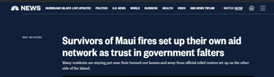 《紐約時報》8月13日發(fā)表報道稱,毛伊島野火造成2200多幢建筑倒塌,許多受災居民缺少熱食、飲用水和庇護所。災難發(fā)生后,當?shù)刂驹刚呓M成了比聯(lián)邦和地方機構(gòu)更可靠的“生命線”。有居民表示,從聯(lián)邦和地方政府手中得到的救助遠沒有從私人志愿者處得到的多。