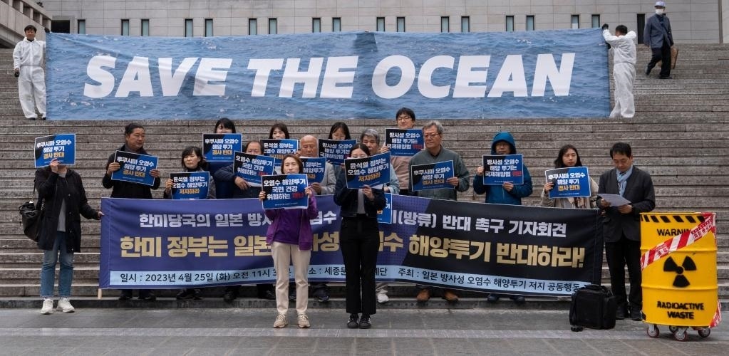 4月25日,在韓國首爾,民眾手舉標(biāo)語抗議日本政府核污染水排海計(jì)劃。新華社發(fā)(李相浩攝)