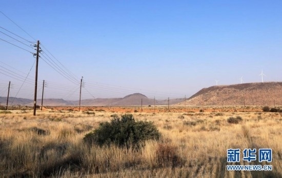 這是8月10日在南非北開普省德阿鎮(zhèn)拍攝的龍?jiān)茨戏枪镜掳L(fēng)電項(xiàng)目風(fēng)機(jī)和輸電線路。 新華社記者 董江輝 攝