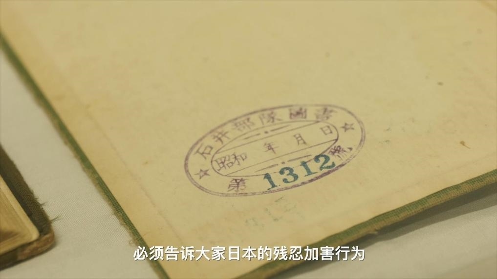 圖為飯?zhí)锸泻推狡砟铕^展廳內(nèi)展出的蓋有“石井部隊”印章的《人體解剖學(xué)》書籍內(nèi)頁。(視頻截圖)