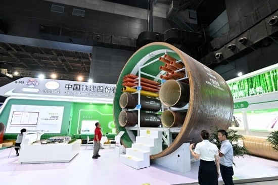9月2日,在國家體育館舉行的服貿會環(huán)境服務專題展上,客商在中國鐵建展位竹纏繞管廊旁了解信息。新華社記者 李鑫 攝