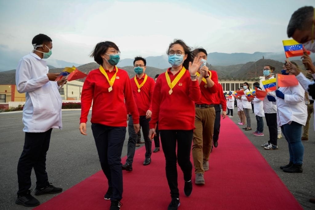 2020年4月11日,在委內(nèi)瑞拉首都加拉加斯,中國(guó)抗疫醫(yī)療專家組在授勛儀式結(jié)束后登機(jī)回國(guó)。新華社發(fā)(薩爾戈多攝)