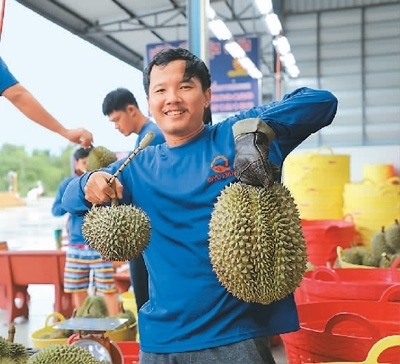 春蓬府位于泰國南部,距離曼谷400多公里,是泰國南部最大的榴蓮種植區(qū)。泰國榴蓮主要種植于東部和南部地區(qū),東部榴蓮上市時間較早,集中在4月至6月,而南部稍晚,于6月至9月成熟收獲。春蓬府農業(yè)局局長素班告訴記者,今年南部榴蓮總產量63萬噸,其中春蓬府約33萬噸。素班說,泰國榴蓮近80%銷往國際市場,中國市場占總出口量90%以上。