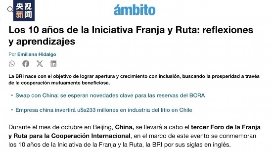阿根廷著名經(jīng)濟(jì)類日報《金融界報》在官網(wǎng)發(fā)表評論文章,回顧了共建“一帶一路”倡議的發(fā)展歷程和帶給世界的思考和借鑒。文章稱,經(jīng)過十年發(fā)展,該倡議已覆蓋全球150多個國家,為世界互利共贏合作樹立了榜樣。
