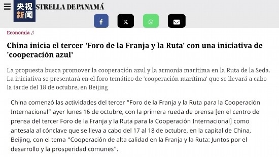 第三屆“一帶一路”國際合作高峰論壇也受到多國主流媒體關(guān)注。巴拿馬歷史最悠久,全國發(fā)行量最大的日報之一《巴拿馬星報》刊發(fā)了主題報道,聚焦高峰論壇發(fā)布的《“一帶一路”藍(lán)色合作倡議》,并評論稱這一倡議體現(xiàn)了中國對于高質(zhì)量推進(jìn)“一帶一路”海洋合作的高度重視。