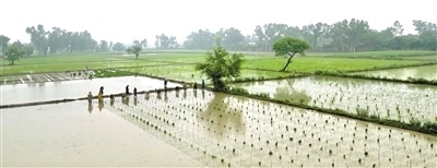 時值正午,驕陽似火。在拉合爾西南郊的一處雜交水稻試驗(yàn)田里,來自中國湖南的農(nóng)業(yè)專家龍春久正在同當(dāng)?shù)剞r(nóng)民和技術(shù)員一起進(jìn)行雜交水稻選種試驗(yàn)。頭戴草帽,褲腳挽至膝蓋,龍春久在泥濘的水田里彎腰插秧,汗水從他黝黑的面龐上淌下。