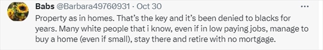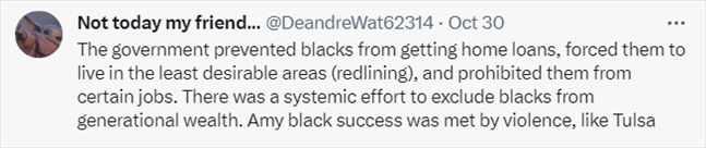 還有網(wǎng)友表示,美國政府在加劇美國財(cái)富不平等方面“功不可沒”。在美國政策高壓之下,非裔甚至不配擁有住房。