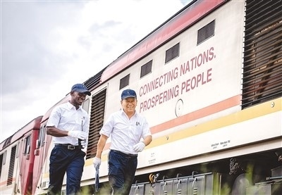 在肯尼亞內(nèi)羅畢,非洲之星鐵路運(yùn)營(yíng)公司機(jī)輛部的火車駕駛員(右)與學(xué)員從蒙內(nèi)鐵路機(jī)車旁走過(guò)。新華社記者 王冠森攝