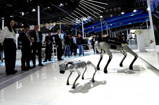 11月7日,在第六屆進(jìn)博會(huì)技術(shù)裝備展區(qū),觀眾在觀看??怂箍嫡故镜闹悄軝C(jī)器狗。