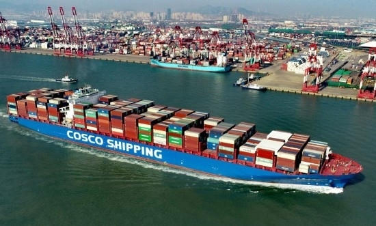 2021年2月19日,在位于山東自貿(mào)試驗(yàn)區(qū)青島片區(qū)的山東港口青島港前灣集裝箱碼頭,一艘滿(mǎn)載集裝箱的貨輪駛出港口。
