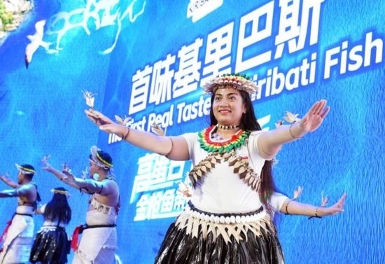 11月8日,來(lái)自基里巴斯的參展人員在基里巴斯水產(chǎn)品推介活動(dòng)上表演。