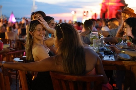 人們?cè)诳ㄋ占{古城墻上的酒吧聚會(huì),欣賞加勒比海落日。唐薇 攝