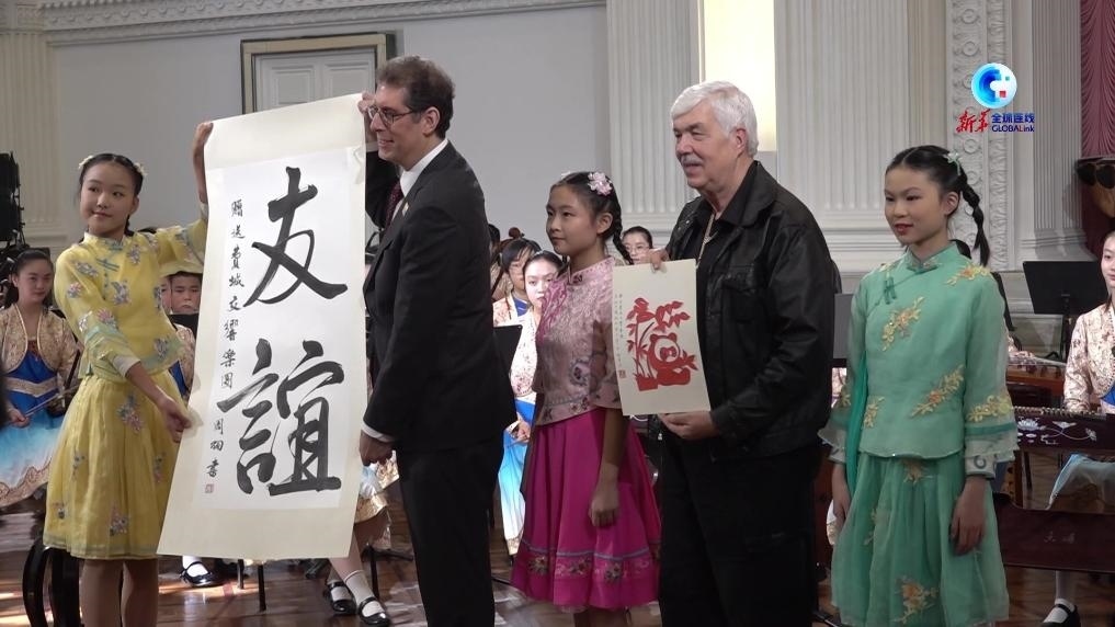 兩名少年兒童把在現(xiàn)場完成的寫有“友誼”二字的書法作品和以熊貓為主題的剪紙作品,作為禮品贈送給費城交響樂團。