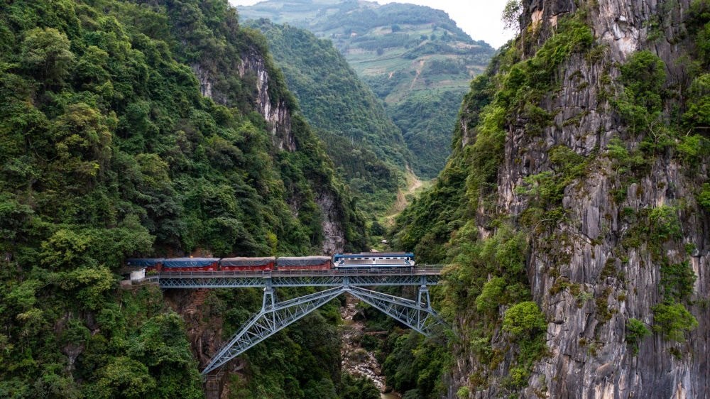 一輛開往越南的貨運(yùn)列車通過云南省紅河哈尼族彝族自治州河口縣的中越鐵路橋(2007年5月19日攝)。