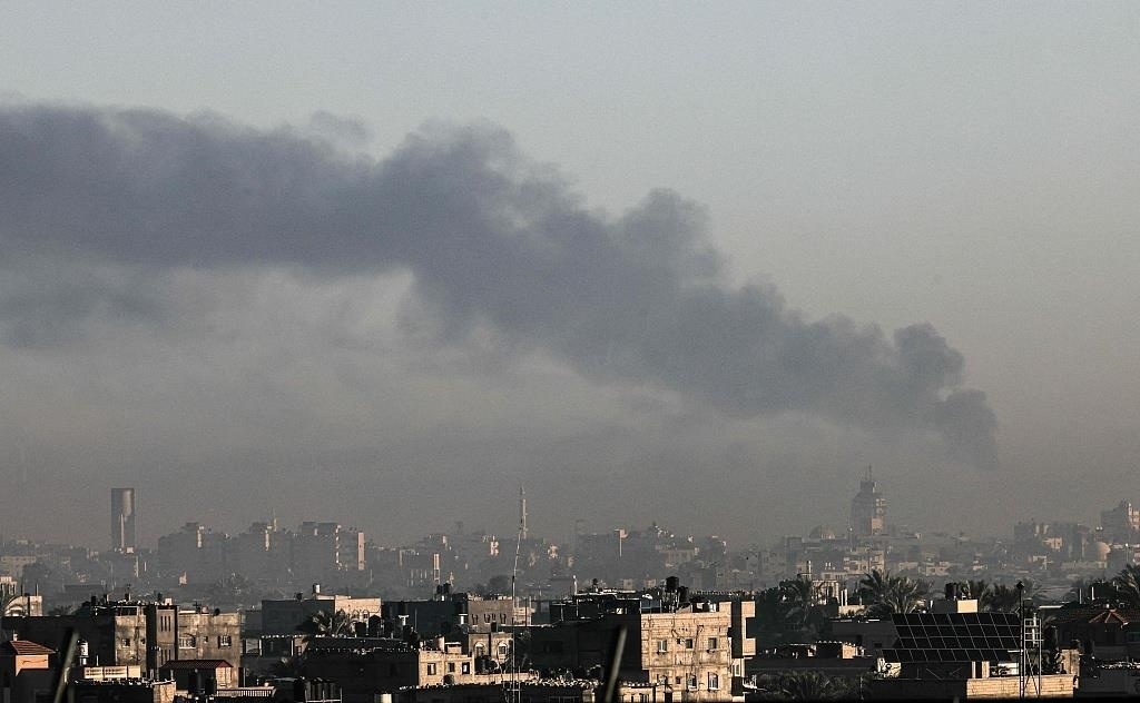 △當(dāng)?shù)貢r(shí)間12月15日,以色列空襲過(guò)后,加沙地帶南部城市汗尤尼斯上空濃煙滾滾。