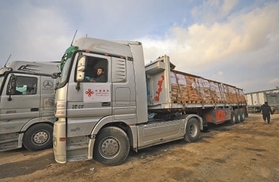 12月17日,載有中國援助的人道主義物資的貨車抵達凱雷姆沙洛姆口岸加沙地帶一側。亞西爾·庫迪攝(新華社發(fā))