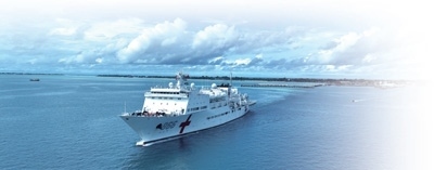7月22日,正在執(zhí)行“和諧使命—2023”任務的中國海軍“和平方舟”號醫(yī)院船結束對基里巴斯的訪問駛離塔拉瓦港。桂江波攝(新華社發(fā))