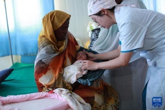 2023年2月22日,中國援蘇丹醫(yī)療隊婦產科醫(yī)生劉韡在蘇丹阿布歐舍醫(yī)院的病房為一名新生兒做檢查。新華社發(fā)(中國援蘇丹醫(yī)療隊供圖)