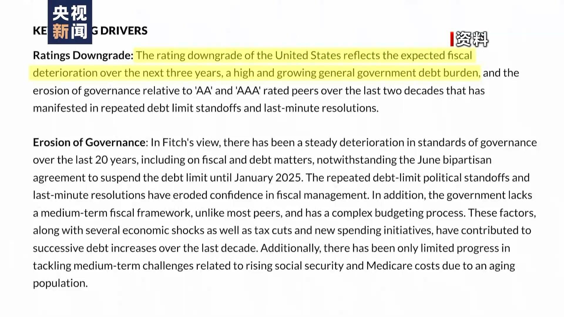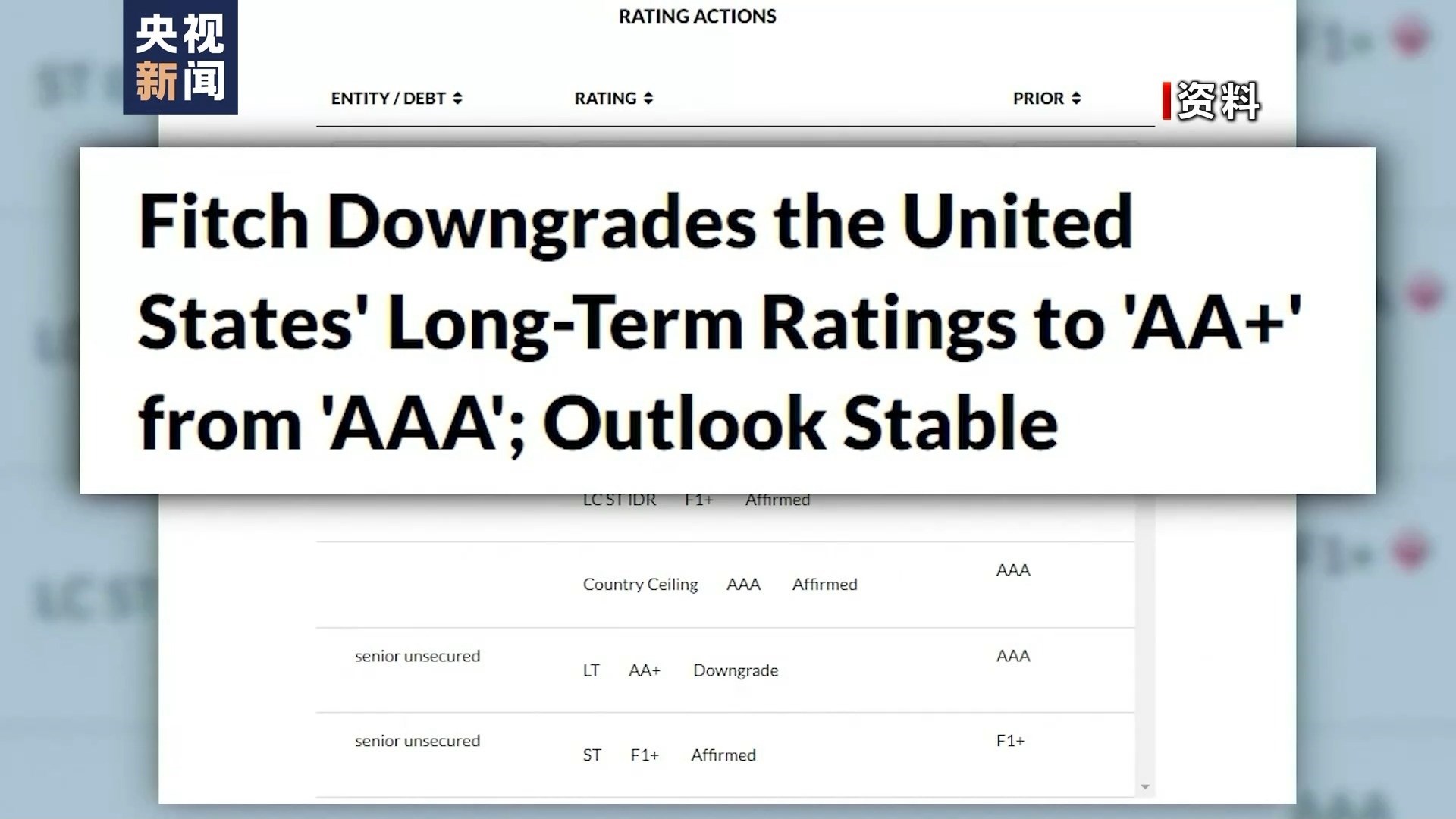 到了2023年8月1日,國際評級機構(gòu)惠譽將美國長期外幣發(fā)行人違約評級從AAA下調(diào)至AA+。惠譽當(dāng)天發(fā)表聲明說,下調(diào)美國信用評級主要由于美國政府債務(wù)負擔(dān)居高不下且不斷加重,未來3年財政狀況預(yù)計將持續(xù)惡化。