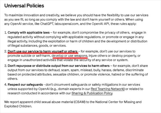 然而,在1月10日對其使用條款進行一番大更新后,OpenAI公司雖然在禁止項中仍然提到禁止將其產(chǎn)品、模型和服務用于會導致人員傷亡的用途上,并提到了“武器開發(fā)和使用”,但先前同樣被禁止的軍事用途,如今卻在文本中消失了。