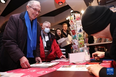 1月26日,在法國巴黎舉行的發(fā)行儀式上,郵票設(shè)計(jì)者陳江洪為當(dāng)?shù)丶]愛好者簽字留念。新華社記者 高靜 攝