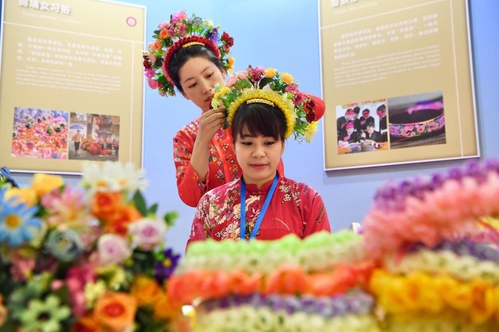 2月2日,兩名女孩在2024中國(guó)-東盟人文交流年展覽活動(dòng)上展示福建蟳埔女頭飾。新華社記者 姜克紅 攝