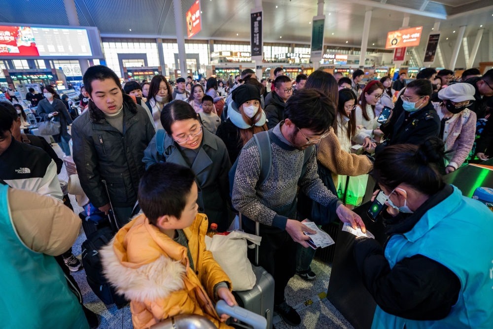 2月14日,乘坐中老鐵路國際旅客列車前往老撾的游客在昆明南站檢票進站。