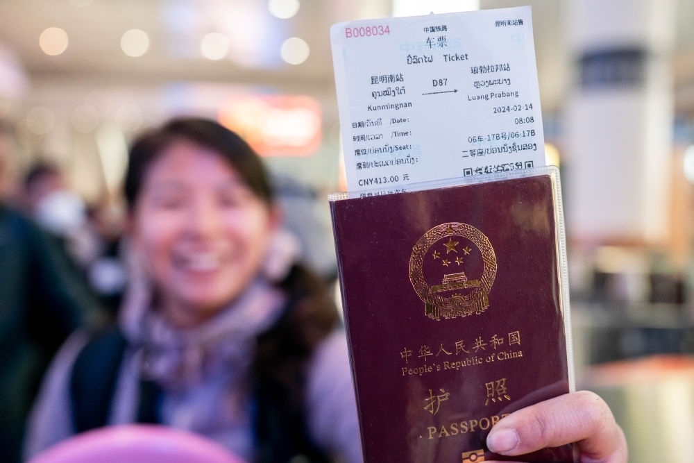 2月14日,乘坐中老鐵路國際旅客列車前往老撾的游客展示購買到的車票。