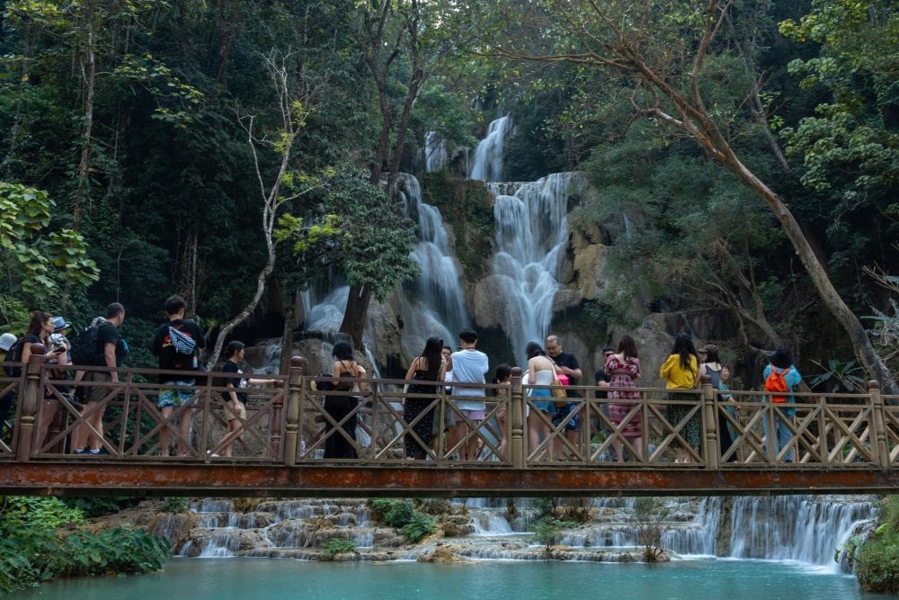 2月16日,游客在游覽老撾瑯勃拉邦光西瀑布。