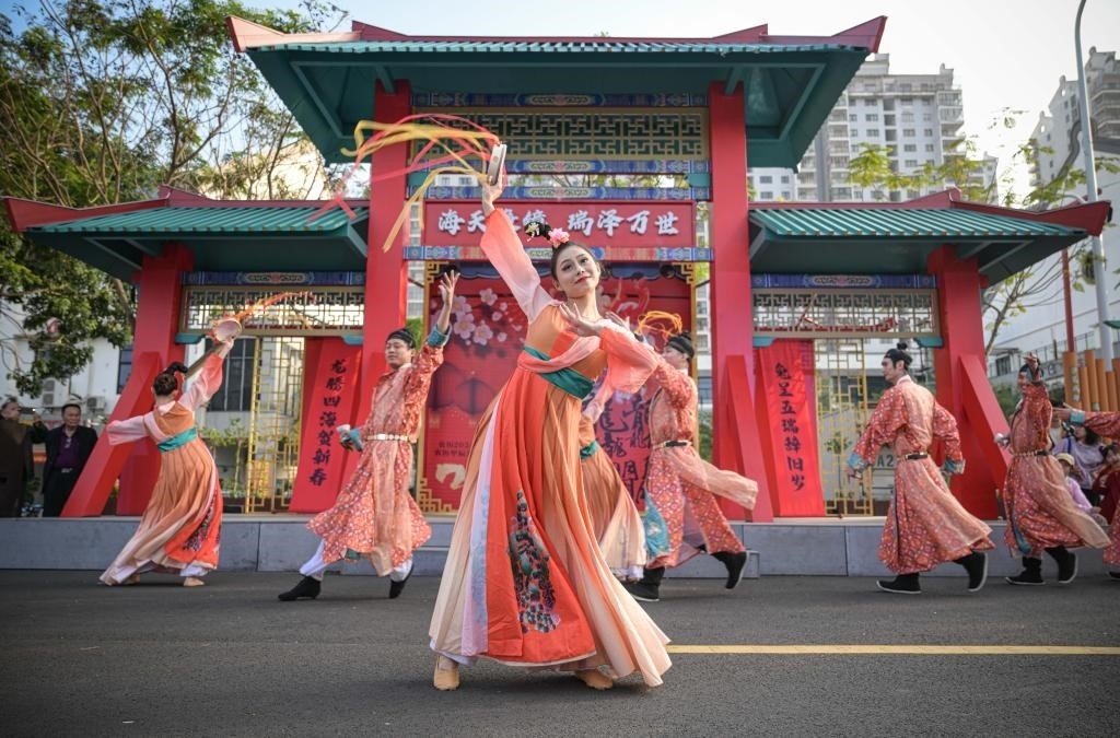 2月12日,在位于海南省海口市的第十六屆萬春會分會場——海瑞文化公園春節(jié)系列活動中拍攝的舞蹈演藝現(xiàn)場。新華社記者蒲曉旭攝