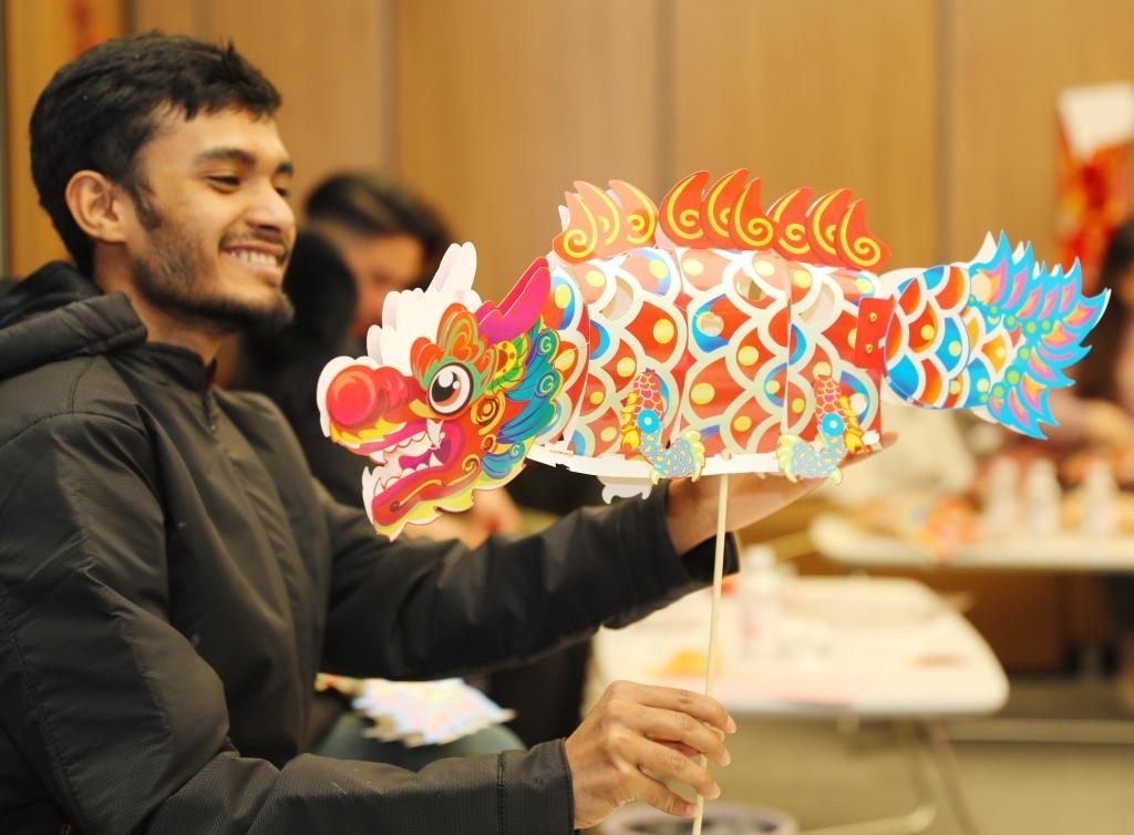 ?2月23日,在山東自貿(mào)試驗區(qū)青島片區(qū),外國留學生拼裝龍形花燈。新華社發(fā)(張進剛攝)