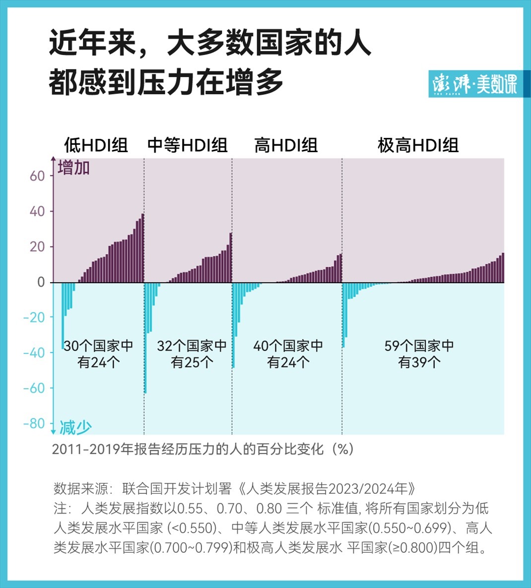 報(bào)告顯示,2011至2019年間,大多數(shù)國家自主報(bào)告“在昨天大部分時(shí)間里”經(jīng)歷壓力的人數(shù)占比增加。