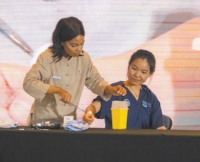 在2023年舉行的第二十二屆“漢語橋”世界大學(xué)生中文比賽南非賽區(qū)決賽中,來自西開普大學(xué)中醫(yī)孔子學(xué)院的學(xué)生希諾(左)展示針灸治療。 本報(bào)記者 鄒 松攝