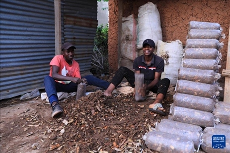 4月6日,在盧旺達南方省穆漢加市附近,工人在尼揚博·奧貝德的工坊裝菌袋。 新華社記者 董江輝 攝