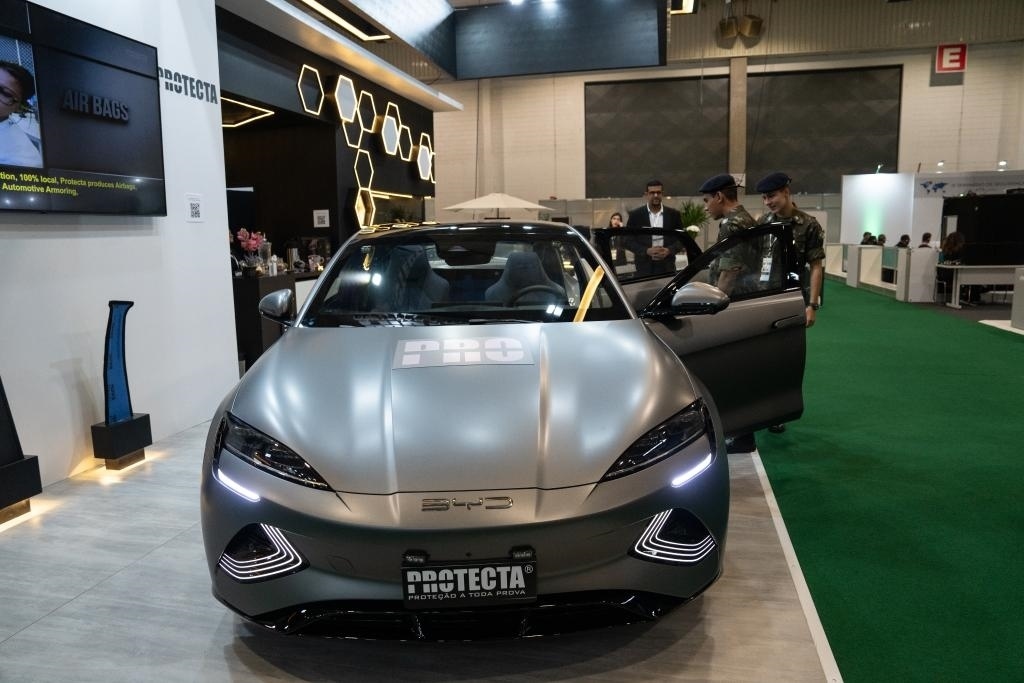 ?4月4日,在巴西圣保羅舉行的巴西防務(wù)展上,參觀者體驗一輛經(jīng)過防彈加固的比亞迪海豹電動汽車。新華社記者王天聰攝