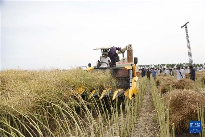 這是由武漢慶發(fā)禾盛農(nóng)業(yè)發(fā)展有限公司與巴基斯坦農(nóng)業(yè)企業(yè)EVYOL集團在當?shù)嘏e辦的油菜籽收割設備技術推介活動,吸引了當?shù)財?shù)百家農(nóng)戶代表參與。2022年,中巴兩家企業(yè)簽署了在巴開發(fā)油菜品種和食用油產(chǎn)業(yè)鏈的諒解備忘錄,推廣種植通過中國先進農(nóng)業(yè)技術選育出的新一代甘藍型雜交雙低油菜品種。