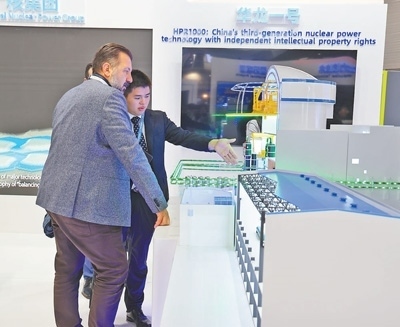 2023年11月,在法國巴黎舉行的第五屆世界核能工業(yè)博覽會上,參觀者在中國廣核集團有限公司展臺前了解“華龍一號”核電機組模型。本報記者 尚凱元攝